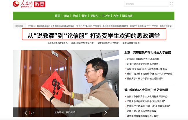 1月29日,人民网以《从“说教灌”到“论信服” 打造受学生欢迎的思政课堂》为题,在教育频道头条对我校区实施“论信服”教学法推进思政课教学改革进行专题报道,并在首页要闻区进行推荐。