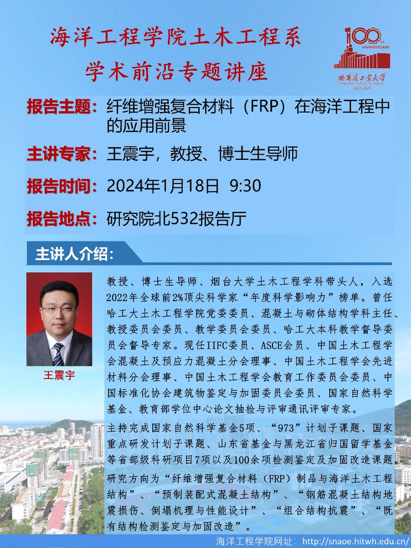 报告人简介:王震宇,男,1971年生,黑龙江哈尔滨人,教授、博士生导师、烟台大学土木工程学科带头人,入选2022年全球前2%顶尖科学家“年度科学影响力”榜单。2001年6月于哈尔滨工业大学工程力学专业获博士学位(导师:李惠院士),2001年7月至2021年6月于哈尔滨工业大学土木工程学院任教,曾任学院党委委员、混凝土与砌体结构学科主任、教授委员会委员、教学委员会委员、哈尔滨工业大学本科教学督导委员会督导专家。研究方向为“纤维增强复合材料(FRP)制品与海洋土木工程结构”、“预制装配式混凝土结构”、“钢筋混凝土结构地震损伤、倒塌机理与性能设计”、“组合结构抗震”、“既有结构检测鉴定与加固改造”。作为项目负责人,主持完成国家自然科学基金5项、“973”计划子课题1项、国家重点研发计划子课题1项、山东省基金与黑龙江省归国留学基金等省部级科研项目7项以及100余项检测鉴定及加固改造横向课题,骨干参与“863” 计划重点项目等10余项科研项目。主编“十三五”重点规划图书1部、参编学术专著1部,主审或参编CECS标准7部,曾获华夏建设科学技术二等奖、黑龙江省科技进步二等奖、三等奖,现任IIFC委员、ASCE会员、中国土木工程学会混凝土及预应力混凝土分会理事、中国土木工程学会先进材料分会理事、中国土木工程学会教育工作委员会委员、中国标准化协会建筑物鉴定与加固委员会委员、国家自然科学基金、教育部留学回国人员科研启动基金、教育部学位中心论文抽检与评审通讯评审专家。