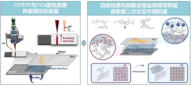 近日,校区材料科学与工程学院檀财旺教授团队在金属与热塑性复合材料激光焊接领域取得重要研究进展,提出了一种通过化学合成功能性高分子结构定向诱导高密度二次交互作用的界面调控手段,实现焊接接头强度显著提升。相关成果以《功能性席夫碱聚合物定向诱导高密度二次交互作用提升TC4/CFRTP激光连接接头可靠性》(Directionally induced high-density secondary interaction for enhancing the bonding reliability of titanium alloy and CFRTP via functional Schiff base-contained polymer)为题发表在复合材料领域顶刊《Composites Part B: Engineering》(中科院1区TOP期刊,影响因子13.1)上。校区春雁英才计划入选者博士研究生苏健晖为第一作者,檀财旺教授、宋晓国教授为论文通讯作者。该项目得到了国家自然科学基金、山东省优青、哈工大青年拔尖人才、中车研究院等基金的资助。